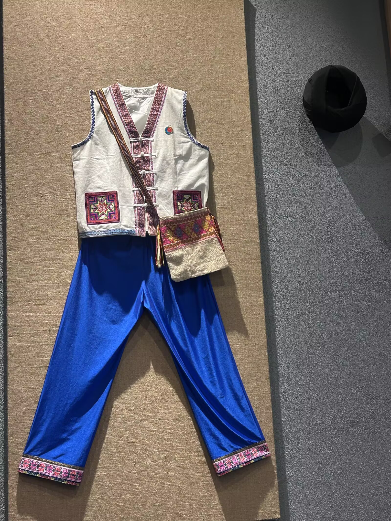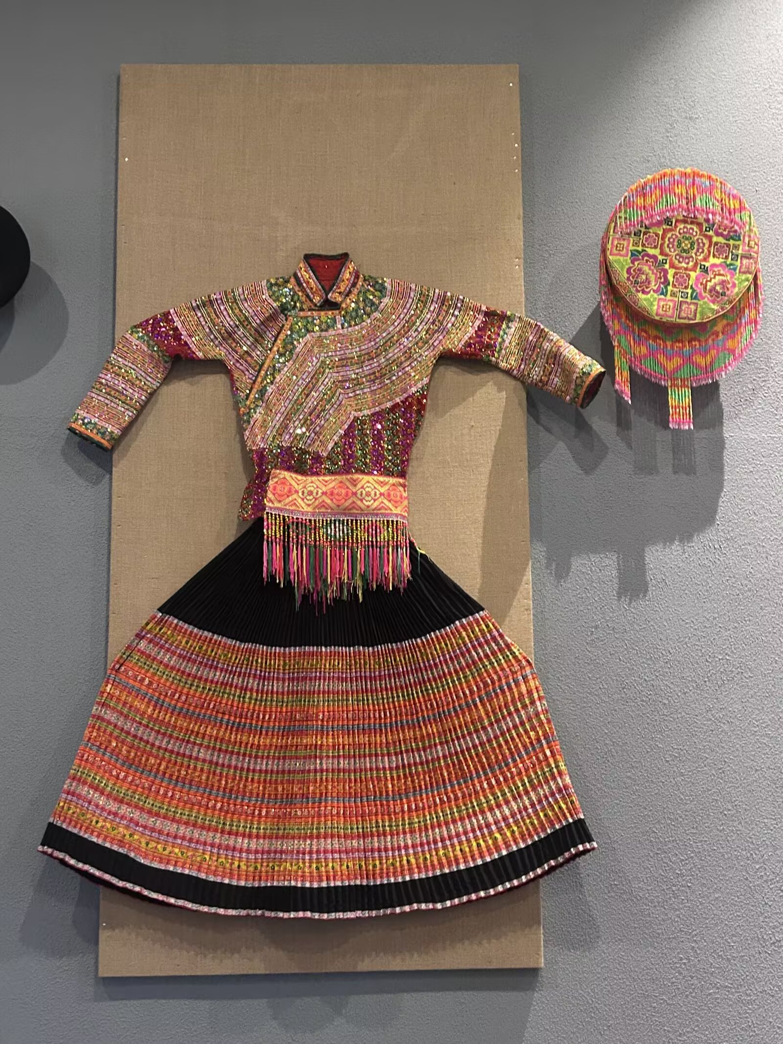 踏入博物馆,一件件傈僳族服饰有序陈列,瞬间抓住实践团成员目光。这些服饰色彩鲜明,以红、绿、蓝为主色调,搭配和谐自然。女式服饰最具特色,上衣绣有栩栩如生的花鸟图案与几何纹样,针脚细密工整;多层叠缀的裙裾采用传统缝制工艺,每一道褶皱都经过精心处理。男式服饰则以简约风格为主,配饰设计精巧,纹样细节处融入傈僳族生活元素,体现出独特的民族审美与文化内涵。