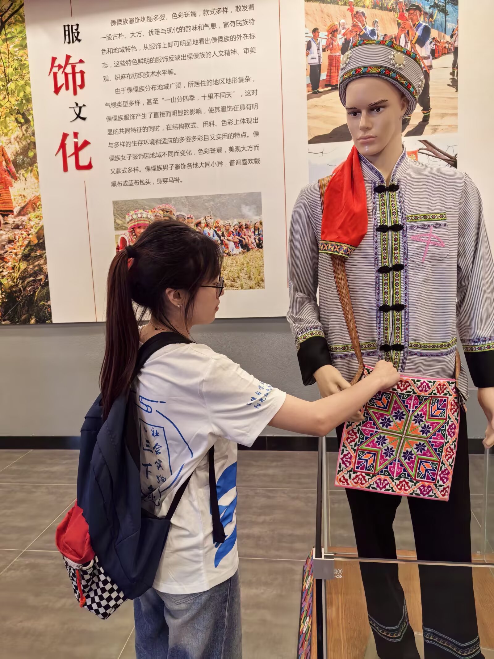 参观过程中,实践团成员通过自主观察、交流讨论,发现服饰色彩、纹样不单是美观,更承载民族记忆。不同色彩搭配、图案组合,关联傈僳族迁徙故事、生产生活,是民族历史文化的具象表达。例如部分纹样,传承着先辈对自然敬畏、对丰收祈愿,代代相传,让历史借服饰 “活” 在当下。