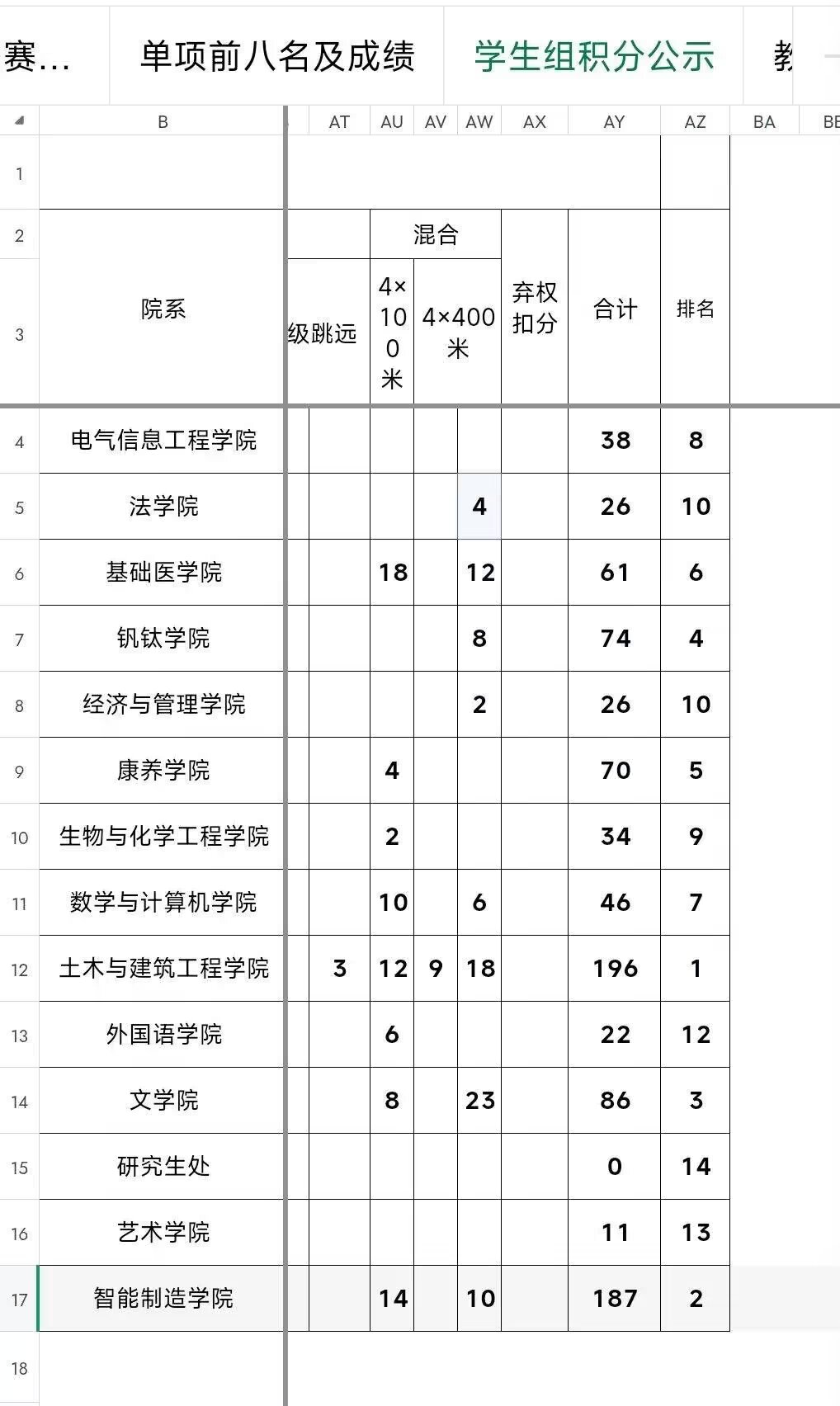 汗水点燃激情,捷报振奋人心。在文学院各位健儿的奋勇拼搏下,我院目前以优异成绩暂居运动会积分榜第三位!赛程尚未结束,精彩仍在继续。愿文院学子稳扎稳打,乘胜前进,在接下来的比赛中再创辉煌!