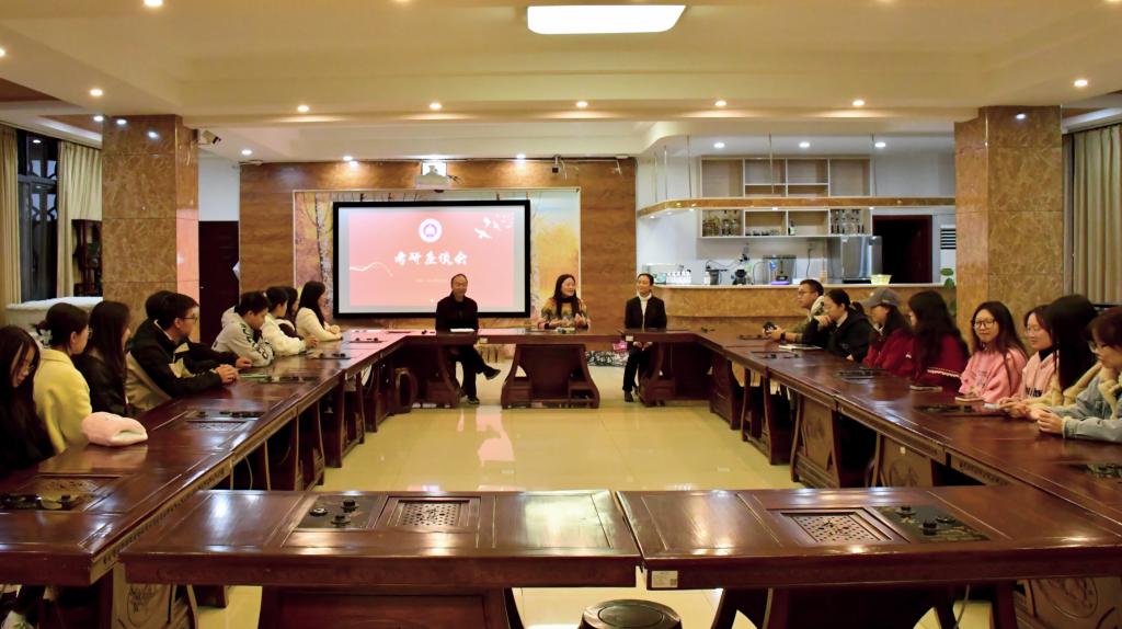为帮助备战考研的学子明晰方向、缓解压力,文学院于11月26日晚在凌云楼茶艺室举办考研专题座谈会。文学院党委副书记郑辉、学生科科长周莹、学生党支部书记兼22级辅导员周立丙与22级考研备考生参与活动。